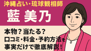 沖縄の観相占いで注目される「琉球観相師 藍美乃(あい みの)」の鑑定は本物?当たる?口コミ・料金・予約方法を事実だけで徹底解説。手相・人相・観相に特化した鑑定の特徴や向いている人まで丁寧に解説します。藍美乃(あい みの)とは?観相特化型の占...